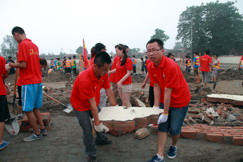 早晨8点,志愿者们经过签到、培训,领取工具、服装、手套等物资后,迅速投入到了清理淤泥、搬运砖块、整理杂物工作中。志愿者们分工协作,在学校的操场上干得热火朝天,汗流浃背,谁都不想停下来歇一歇,大家都想在服务中能更多地为房山灾后的援建工作奉献自己微薄的力量。家住娄子水村小学附近的一位阿姨,一次又一次地为志愿者们送来亲自熬的绿豆汤。