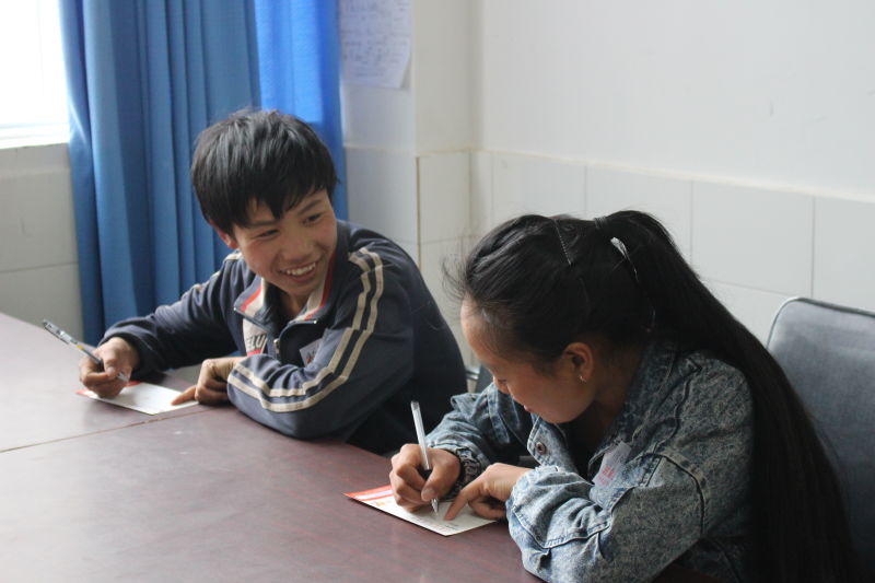 志愿者带来明信片 孩子们在明信片上写上自己的情况和对资助人的心里话 这张卡片将被邮寄给每个孩子各自的资助人