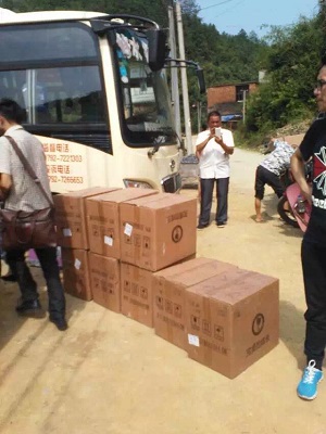 项目组刚抵达乡里时,由于连日的雨水导致山路被冲毁。热心的村民用摩托车一次次的将项目组带给孩子们的教学包送到教学点。