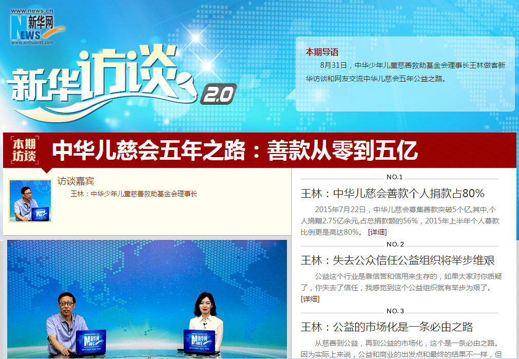 网友们大家好,欢迎收看新华访谈。自2008年汶川地震救灾起,中国公民慈善热情呈井喷式爆发。随着2013年互联网募捐的发展,个人小额捐赠发展迅猛。截止2015年7月,中华儿慈会募集善款突破5个亿。今天我们非常荣幸地请到了中华少年儿童慈善救助基金会理事长王林先生做客新华访谈,和大家聊一聊这数字背后的公益故事。王林先生,您好,欢迎您做客新华访谈,和网友们打声招呼吧。[ 2015-08-31 15:04 ]