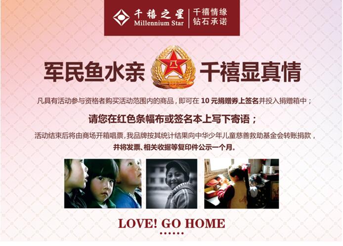 另外啊,我们联合千禧之星珠宝股份有限公司在7月25日-8月25日期间,在北京、天津、内蒙古13家千禧之星的自营门店全场每购买活动产品一件捐出10元现金,现在活动已经圆满结束了哦。