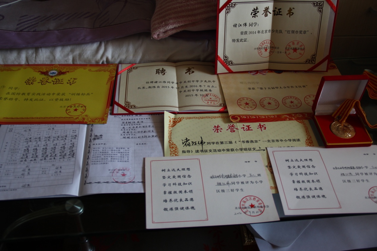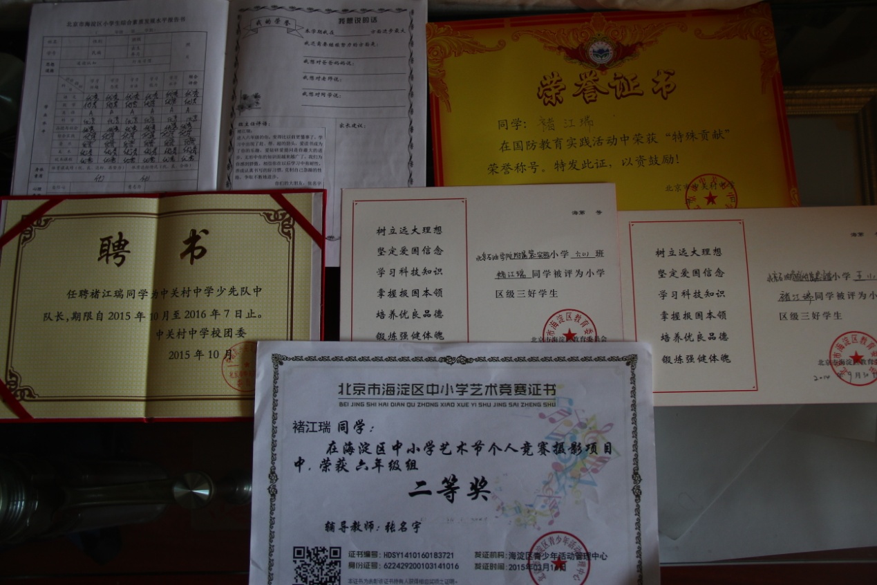我们从郝妈妈那里得知,褚江伟、褚江瑞两兄弟现在中关村中学读书,他们都是通过推优入校,并在学校担任班长兼中队长,褚江瑞曾参加天安门少年先锋岗,只有非常优秀的学生才有机会申请去天安门广场站岗。班主任对他们两兄弟特别好,学校方面也主动提出减免两个孩子的伙食费,他们的学习成绩和体能情况都排在学校前列,每次拿回奖状奖章时就会让郝妈妈开心得合不拢嘴。