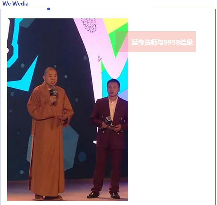 11月21日We Media联盟晚宴的公益环节的主题是传递爱,推广爱!主推9958儿童紧急救助热线。中华儿慈会工作人员和“生命是如此的精彩”的延参法师一同分享了9958爱的生命线、9958爱de故事、爱的起源……。现场延参法师用约三分钟的时间结合“绳命”带出儿童紧急救助热线。延参法师讲到“这个社会是需要您们的力量,不管你是企业家还是普通人,都要付出关怀、付出善意,公益是社会的责任是每个人的责任。9958听起来是别人在提出帮助的信号,其实不是,400-006-9958我们要记在心里,他是我们自己对人生意义的一种思考,这个世界需要彼此的关怀、彼此的关爱。”会场气氛感人!