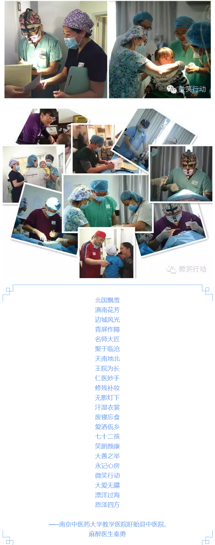 小编决定借用一位志愿者有感而发的诗篇,纪念第11次临沧义诊的圆满结束。能为贫困的先天性面部畸形患者提供安全、高质量的免费修复手术,最要感谢的是幕后几十名来自世界各地的医疗志愿者奔赴千万里来到这个边境小城,用专业技术、用心、用情守护孩子们的微笑。大家一起吃盒饭,早出晚归,一天工作十几个小时的情谊难忘。让我们相约另一个十年,让关爱在佤乡延续。
