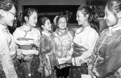 12月24日,北京市海淀区第二实验小学学生与来自青海玉树的小伙伴交流。新年到来前夕,10余名在地震中失去亲人的玉树小学生来到海淀实验二小参加迎新年活动,海淀实验二小学生将开展爱心义卖活动,将义卖所得捐献给玉树的小伙伴。