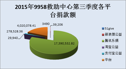 2015年9958救助中心第三季度接收捐赠善款记录2881条,共计21,758,285.59元,其中社会化新媒体网络筹资占总比82%。其中腾讯公益17,390,532.82元,新浪微公益39,206元,支付宝公益278,528.36元,淘宝公益29,940元,51give 平台3,490元。企业筹资和儿慈会网站个人捐赠总计4,020,078.41元。