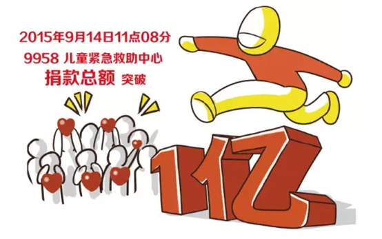 2015年9月14日11点08分,中华儿慈会9958儿童紧急救助中心总筹款额突破一个亿。从0到3000万,9958用了3.3年,从3000万到一亿元,9958只用了1年。