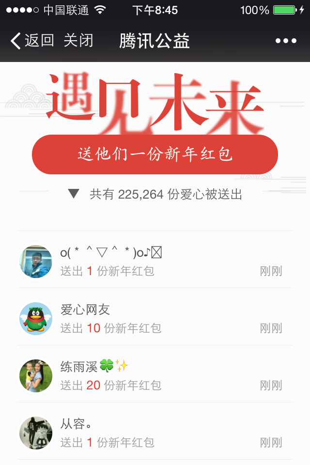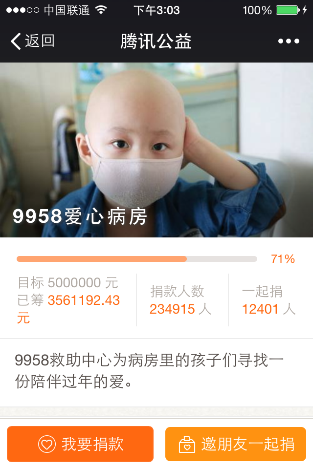 2016新年, 腾讯公益携手9958给病房儿童送红包 这是能让TA们活下来的“红包” 小小红包,大大温暖 聚微爱,成浩瀚 225464份爱心,汇聚成爱的海洋 爱没有停止,爱仍在继续……