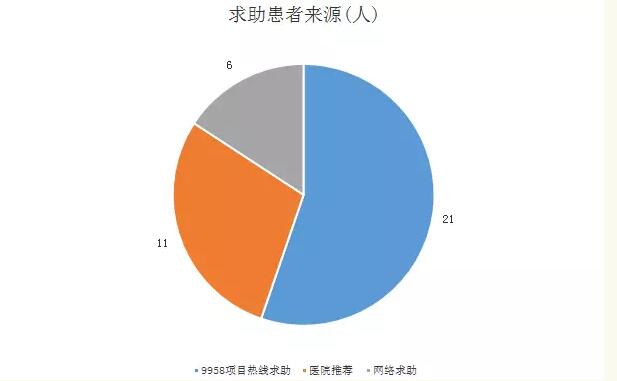 2015年4月到2015年12月期间王正昕儿童肝移植慈善基金总共接到了38人求助,患者主要来源于9958项目热线求助、医院推荐和网络求助。其中,9958项目热线求助总共21人,医院推荐的患者共11名,来源于网络求助的患者总共6人。