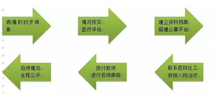 只要向9958项目申请求助的患者,都将会由9958项目的评审团队对患者的病情进行初步的筛查,对于病种符合的,将在进行家庭情况的核实及病情的评估。如病情符合基金的资助,将让患者填写救助申请表,为患者建立资料档案,并搭建网络公募平台。随后在联系医院的社工安排患者入院治疗,并拨付项目救助款到患者所在的医院账户。后续将由社工跟进治疗情况及出院票据的返还,9958项目将根据反馈信息对患者的治疗情况、费用使用情况及出院票据进行全程公布。