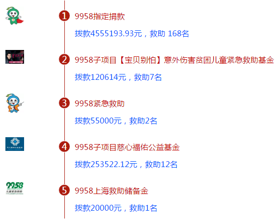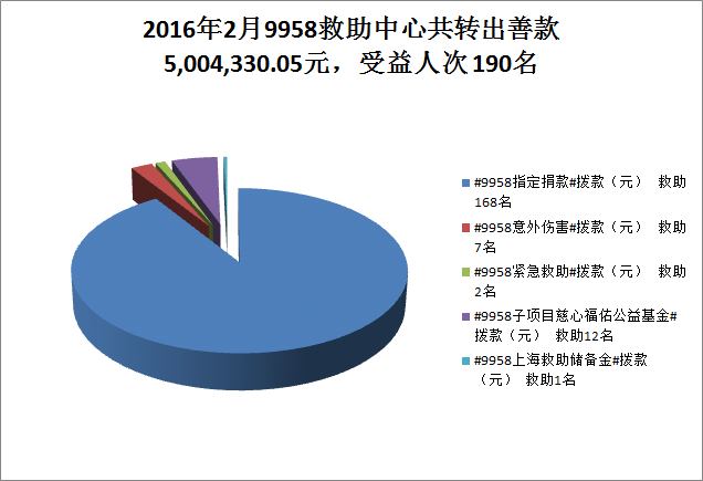 9958救助中心2月共转出善款5,004,330.05元,受益人次 190名;其中9958各子项目储备金拨款449,136.12元救助22名;9958指定捐款拨款4,555,193.93元,救助168名。