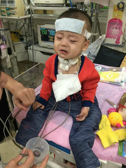 尚泽其实很聪明,他能听懂爸爸妈妈简单的话。爸爸经常会逗弄他,当爸爸说“鼻子”的时候,尚泽就会用自己肉呼呼的小手去揪爸爸的鼻子,爸爸很快又说“耳朵”,尚泽就又忙不迭的去揪爸爸的耳朵,这时候的尚泽眼睛亮晶晶的,咧开了小嘴无声的笑着。因为无法正常发声,所以尚泽一直没有学会说话,他张嘴只能发出低哑的“嘶嘶”的声音,所以即使尚泽快两岁了,他们也始终没有听到那声稚嫩的“爸爸”“妈妈”。尚泽还需要定期进行套管更换手术,直到他可以真正靠自己呼吸的那一天。