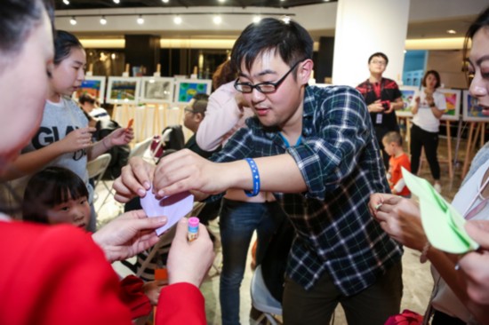 启幕仪式临近尾声,在北京星星雨教育研究所老师的带领下,到场嘉宾在彩纸留下对自闭症儿童的由衷祝福,并将写满祝福的彩纸折成各式各样的形状,将所有的祝福通过童真童趣的折纸传递此次活动的初衷。希望越来越多的人加入关注自闭症群体的队伍中来。