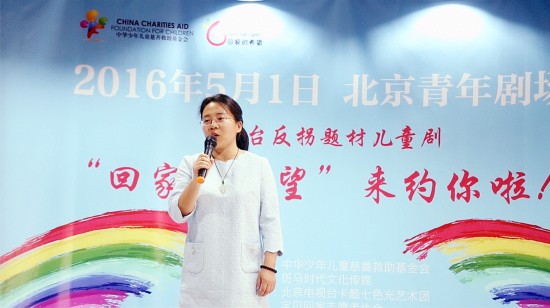 2016年4月10日由中华少年儿童慈善救助基金会(以下简称:中华儿慈会),斑马时代文化传媒主办,北京电视台卡酷七色光艺术团,宝贝回家网,杜克越影文化传媒合作共同推出的首部反拐儿童剧《回家的希望》在青少年阅读体验大世界发布。