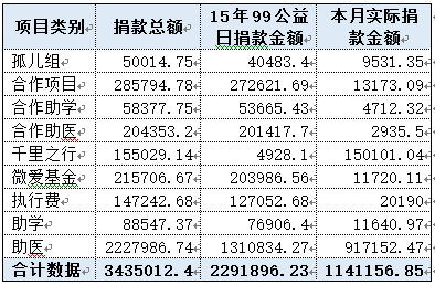 乐捐捐款:3225039.38元(含15年99公益日配捐2291896.23元);淘宝公益捐款:12195元;