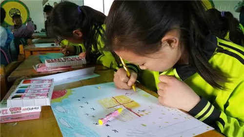 志愿者从上午八点到下午四点,为每个班级上了美术、音乐、心灵成长游戏等共六节课,并为全体师生开展了“蓝丝带”的故事分享活动。