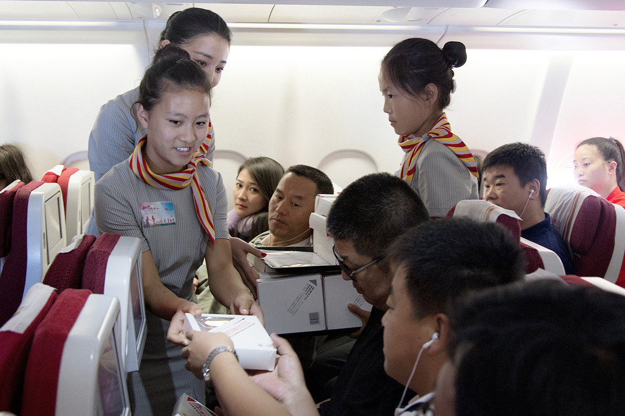 随后,在海南航空工作人员的陪同下,孩子们参观了海南航空北京基地,并进入飞行乘务准备区了解机组人员航前准备会议。参观结束后,孩子们登上北京飞往海口的海航HU7182航班。待航班配餐服务工作结束后,孩子们身着海航空乘制服与机组乘务一起,开始向旅客们发放海南航空公益活动纪念物品和巧克力,航班上的儿童旅客还收到了海南航空精心准备的特色玩偶。此次精心设计的航班活动,赢得旅客们热烈的掌声,孩子们也从中感受到了来自机组人员和旅客们的节日祝福,脸上洋溢着愉悦的笑容。