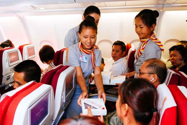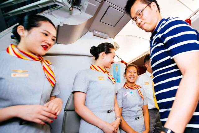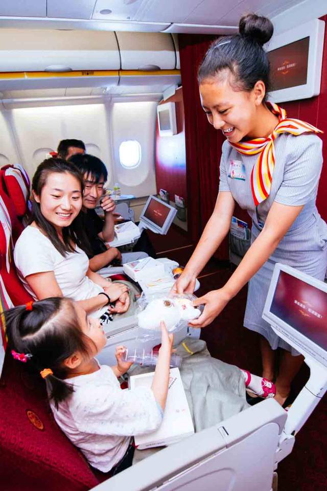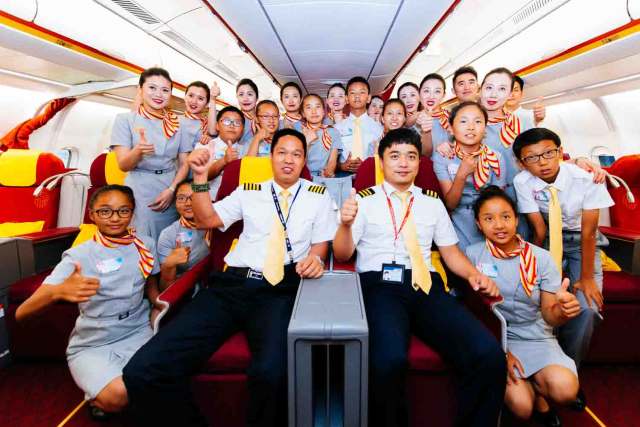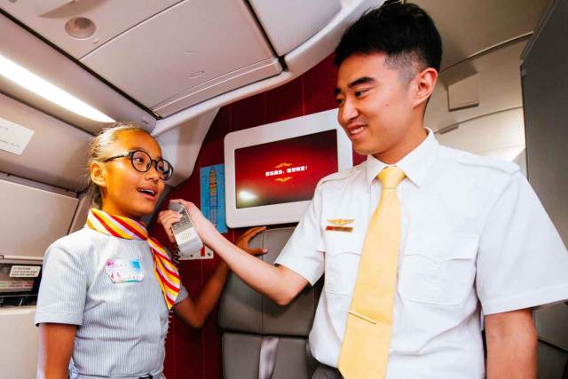 2016年六一儿童节前夕,十名由中华少年儿童慈善基金会救助的玉树儿童受邀搭乘海航班机,化身“小空乘”,亲身感受了飞机机组服务人员的工作。