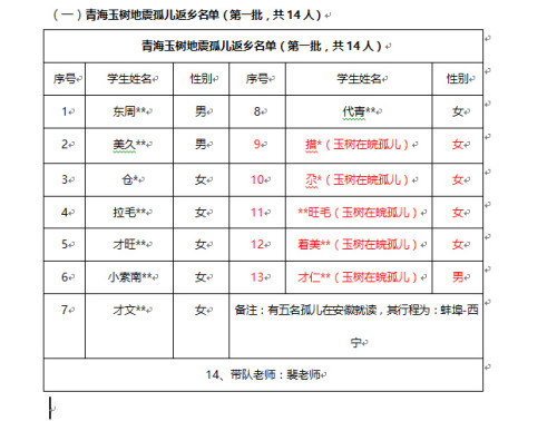 (一)青海玉树地震孤儿返乡名单(第一批,共14人)