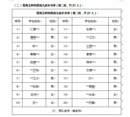 (二)青海玉树地震孤儿返乡名单(第二批,共21人)