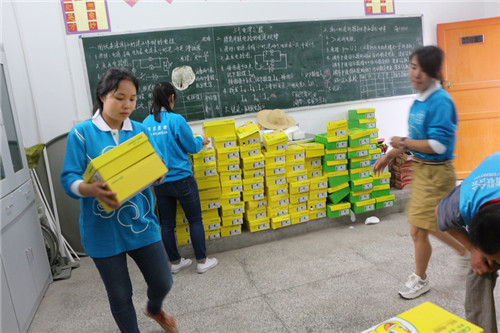 晚饭过后,我们开始一起整理这次准备奖励给孩子们的鞋子,由于学生人数比较多,鞋子也比较乱,整理起来也比较麻烦,直到近9点才将鞋子按年级和姓名分类整理完毕。