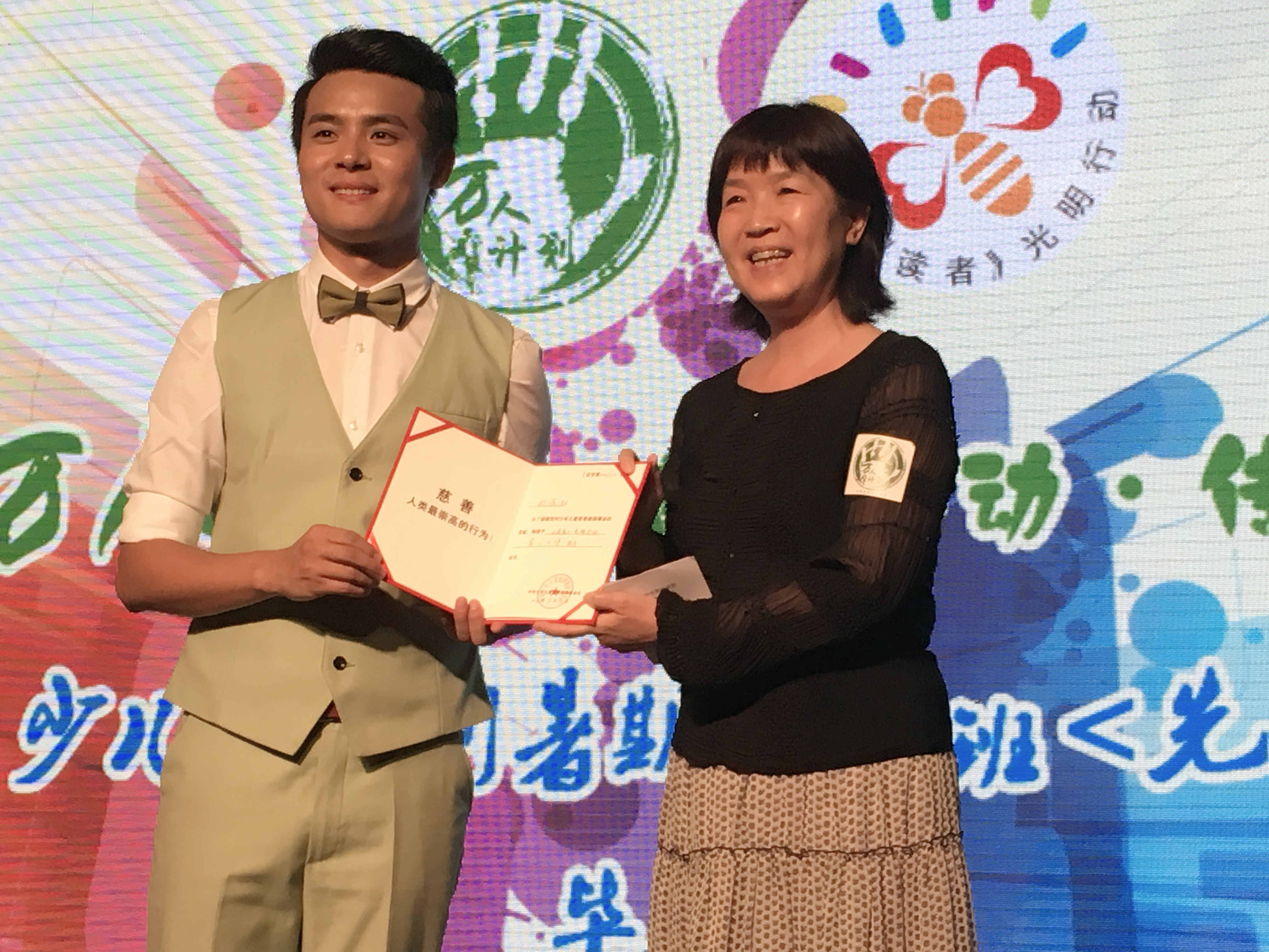儿慈会副秘书长徐惠芳为刘波颁发“《读者》光明行动”爱心大使证书