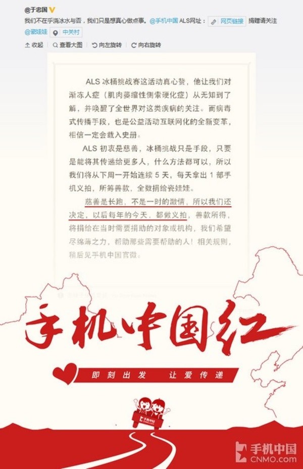 如果你也渴望加入到手机中国红的光明行动中来,请在8月29日-9月3日关注手机中国官方微博,让我们一起共筑人间温暖!来源:凤凰网