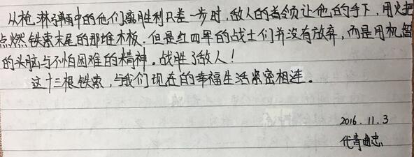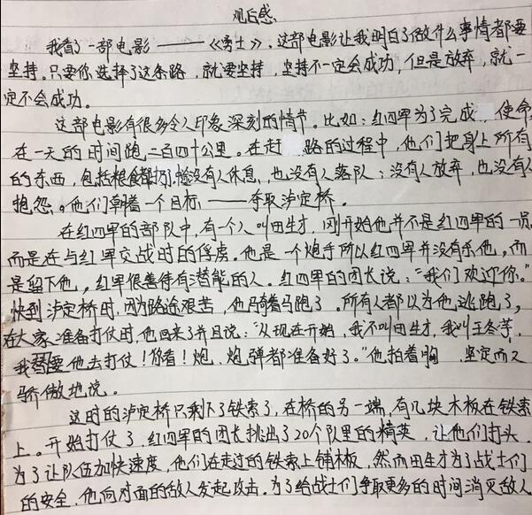 观看影片中,孩子们被红军勇士用生命为代价强渡大渡河的精神而震撼、为红军勇士奋勇杀敌的坚持而感动、为红军勇士不怕流血牺牲的勇敢而敬畏。孩子们用近2个小时的时间了解红军强渡大渡河、飞夺泸定桥的历史、学习红军勇士的无畏精神,是平日里在课本无法学到的。