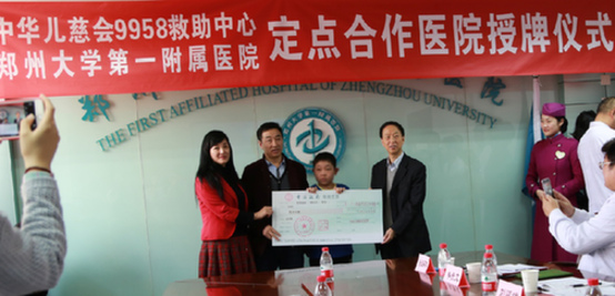 启动仪式上,中华儿慈会秘书长助理王昱,向郑州大学第一附属医院党委书记张水军颁发了“中华少年儿童慈善救助基金会9958儿童紧急救助中心定点合作医院”牌匾,该院肾移植科室成为定点合作科室。部分贫困患儿家属代表获得了“新肾宝贝救助基金”专项救助基金。