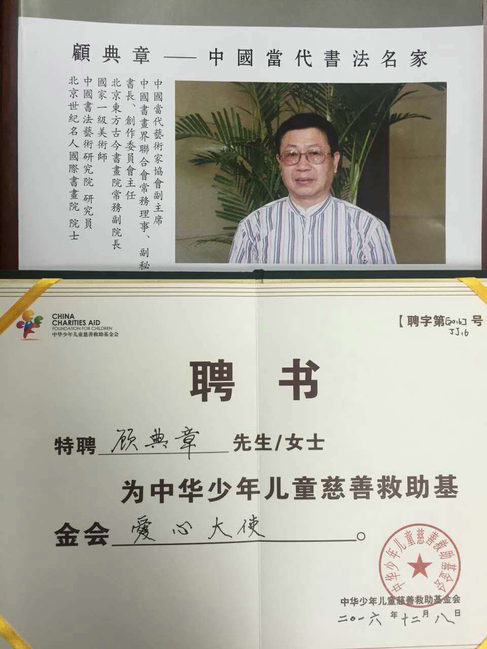 2016年12月8日,益童成长中心聘请国家一级美术师、中国当代艺术家协会副主席顾典章先生为爱心大使。