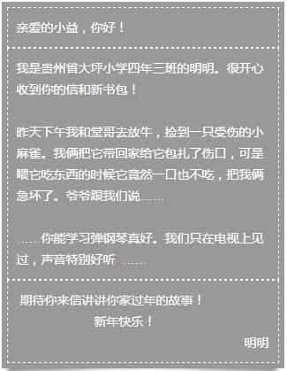 小益放了学,红扑扑的小脸儿上却洋溢着比平常亮一度的微笑。他手里攥着一个褐色的牛皮纸信封,看到来接他放学的妈妈就开心地喊道:“妈妈你看!大山里的小朋友给我回信啦?。?!”