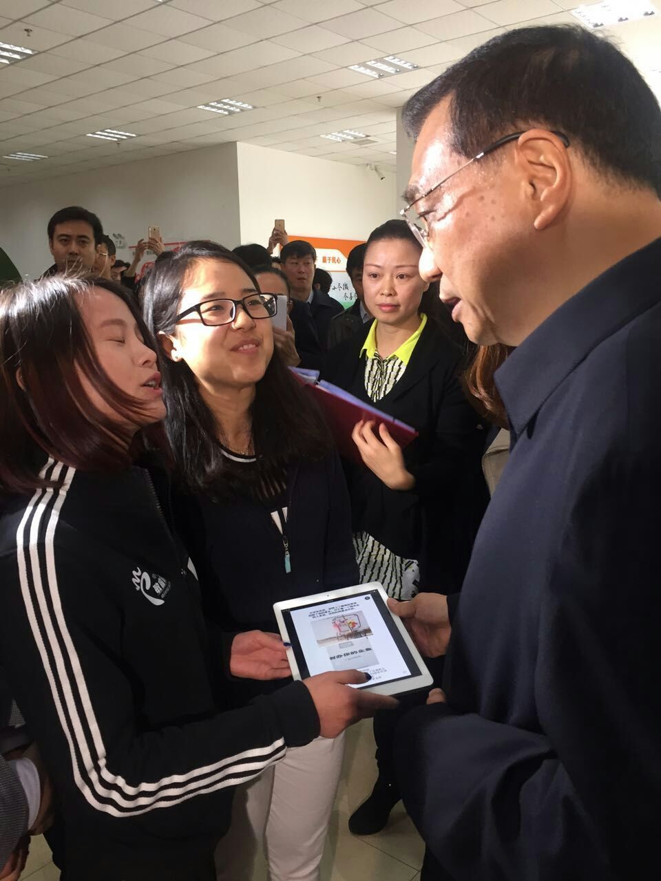 (2016年4月25 日,国务院总理李克强来雅安视察大学生创业工作时,张文梅为总理介绍自己的创业项目)