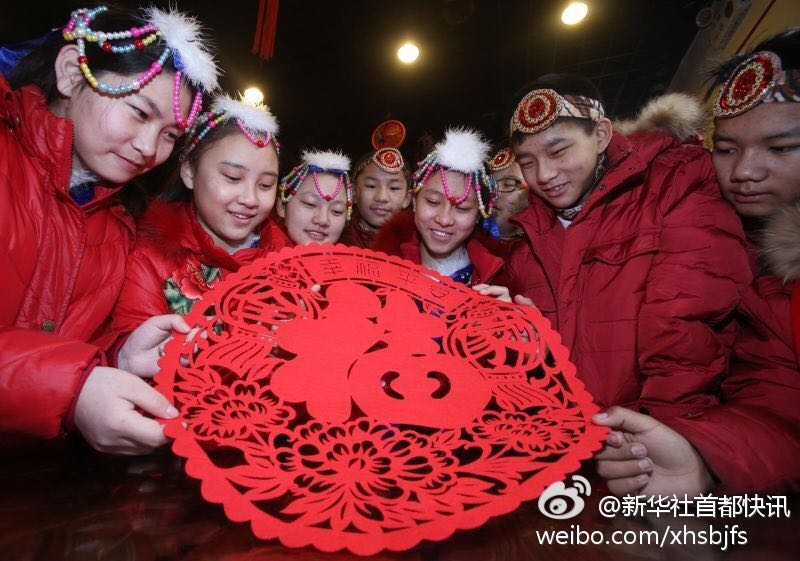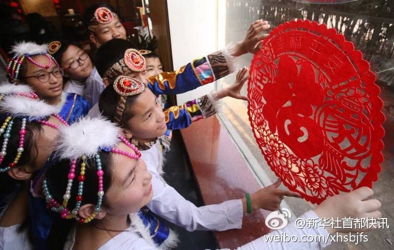 (孩子们高兴地贴窗花,图片来源于新华社首都快讯微博)