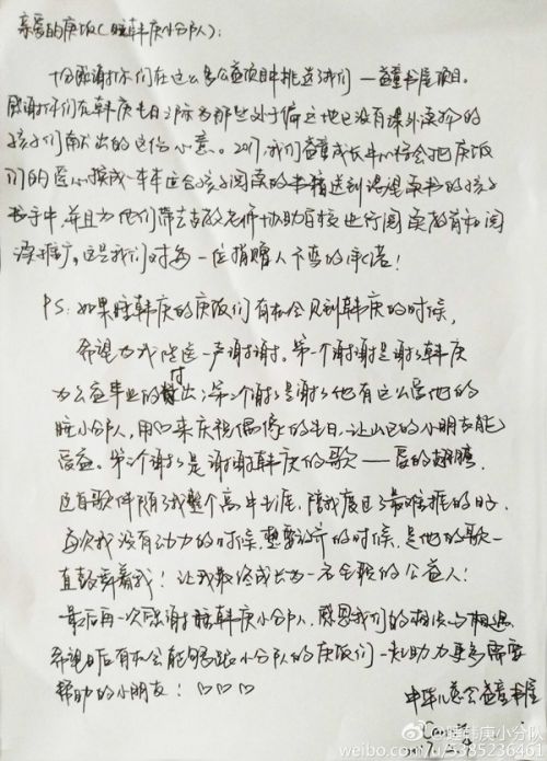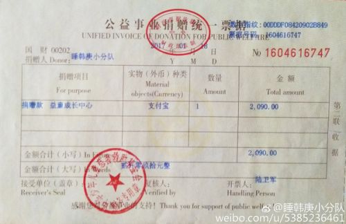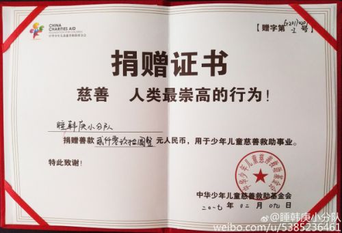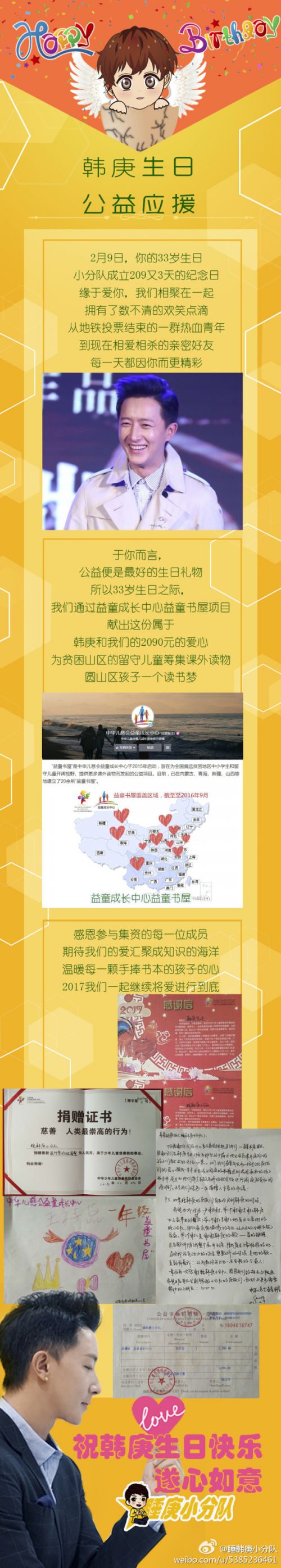 当天韩庚的粉丝@睡韩庚小分队(微博名)向中华少年儿童慈善救助基金会(以下简称:中华儿慈会)益童成长中心-益童书屋项目捐赠善款2090元,用于购买书籍,送到渴望读书的贫困儿童手上。