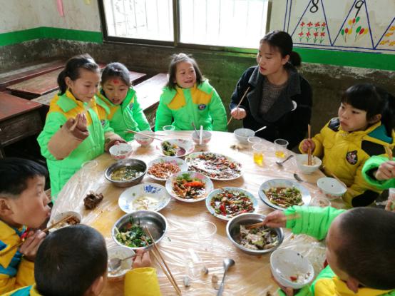 图为志愿者同孩子们一起吃年夜饭。