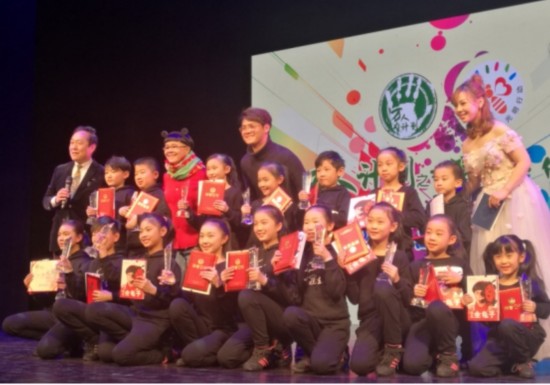 音乐剧公益演出现?。貉胧由俣鞒秩私鸸曜?、青蛙王子为孩子们颁发“优秀学员”奖状和奖杯。(中国网金兰摄)