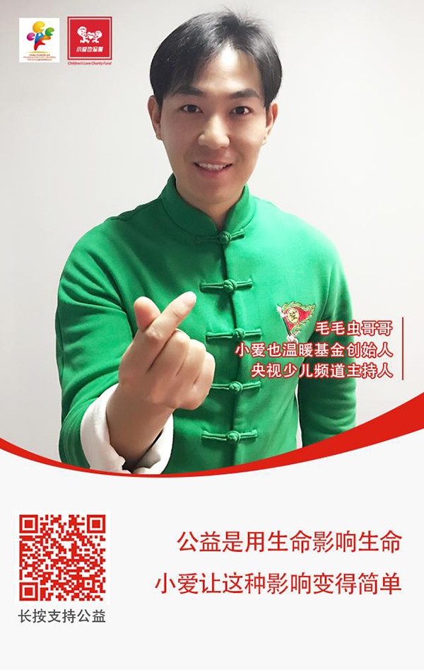 图为小爱也温暖项目发起人、央视少儿频道主持人毛毛虫给孩子回比的爱心。