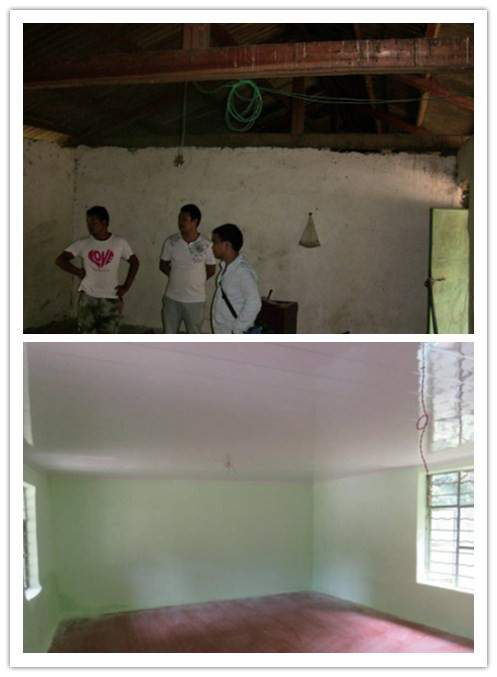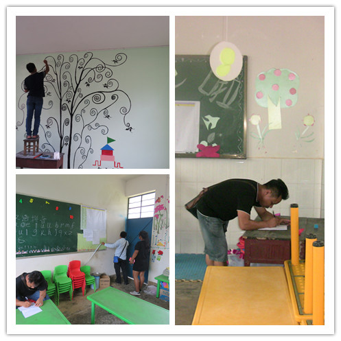 室内装修工作于2016年8月9日开始正式实施。项目组、村委会以及装修承包方一起实地走访了各幼儿班、商讨了教室维修与装饰的内容、要求,并对所需材料费用进行了估算。随后,三方达成一致意见:学生家长与村民无偿投入部分劳力;所需的材料由装修工人统一购买;项目组与村委会领导对室内装修工作进行监督与跟进,以保证工程质量。