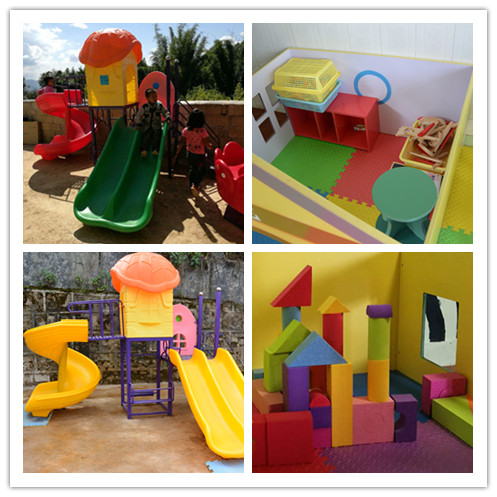 项目团队于9月中旬分别为8个幼儿班(坡永幼儿旗开得胜、英布龙幼儿班、务龙幼儿班、莫窝上组幼儿班、莫窝下组幼儿班、班哲幼儿班、班帅大班和班帅小班)购买了室内及室外的玩具。室内玩具包括积木、桌面玩具、角色游戏玩具、放大镜、几何图形片、天平、乐器组合等;户外玩具包括组合户外滑梯、跷跷板、钻圈、钻洞、转椅、滚筒等。