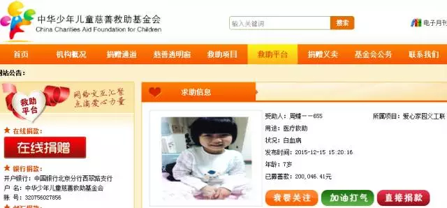 随即,爱心家园分别在儿慈会官网、支付宝公益、腾讯乐捐为孩子搭建了公募平台,获得了成千上万人的爱心支援,这些善款共计282169.93元。