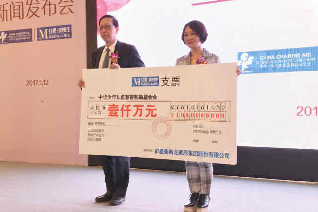 2017年1月12日,红星美凯龙携手中华少年儿童慈善救助基金会(以下简称:中华儿慈会)开展的捐赠公益活动新闻发布会在北京红星美凯龙东四环店顺利举行。捐赠仪式上,红星美凯龙宣布向中华儿慈会捐赠近1000万元家居,共同助力中国困境儿童成长。