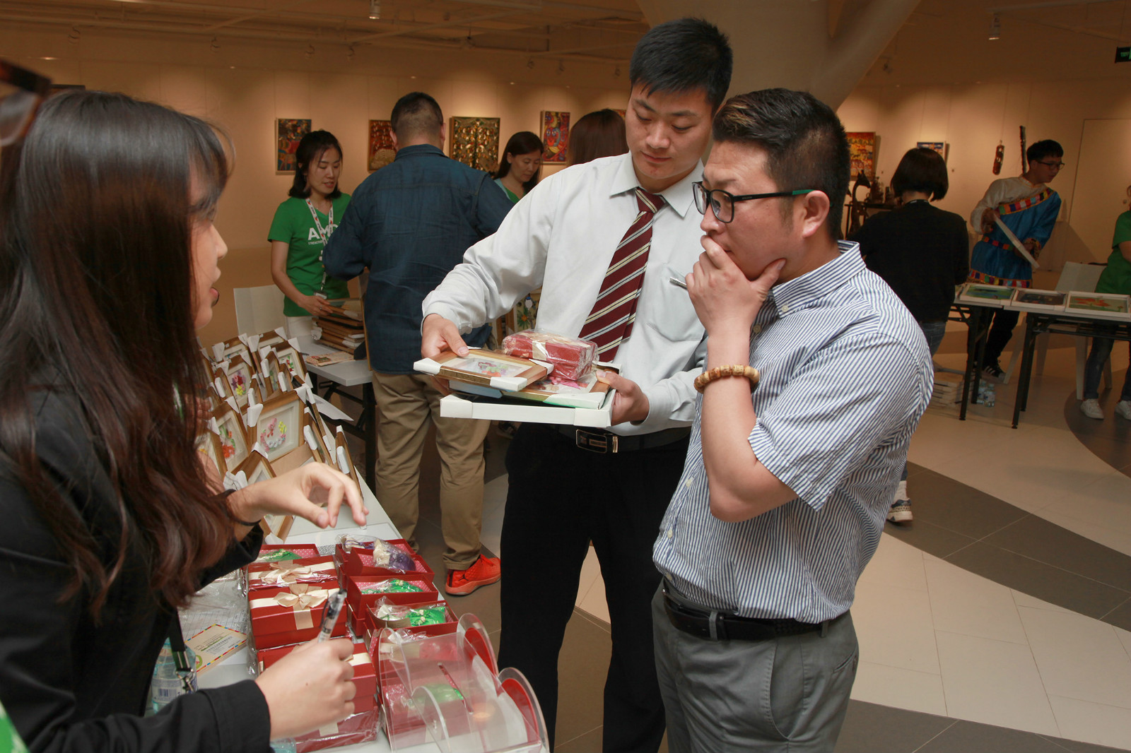 “这是我们自己做的衍纸画,请来看看吧。”益童之家的孩子拿着自己的作品,向路过的人们介绍着。“阿姨,我们做的香囊是可以预防感冒的。”“叔叔,您带着小弟弟进来挑选一幅画送给他吧。”热情的叫卖声从未停过,为了帮孩子们筹集更多的善款,AMD公司的志愿者们,拿着绘画穿梭在行人当中,想让每个人都能关注到这里的义卖、希望每个人都喜欢孩子们的作品,伸出援手。