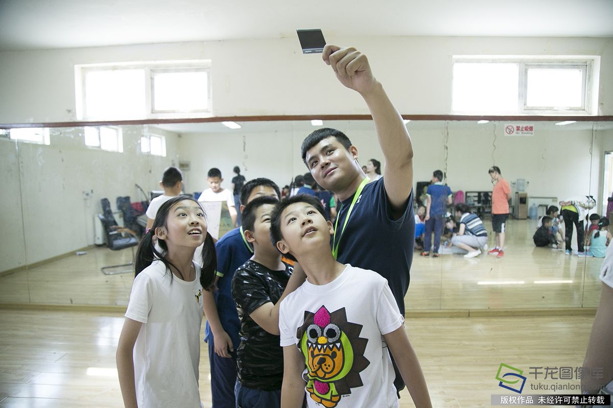 5月14日,田野老师与孩子们一起表演(图片来源:tuku.qianlong.com)。