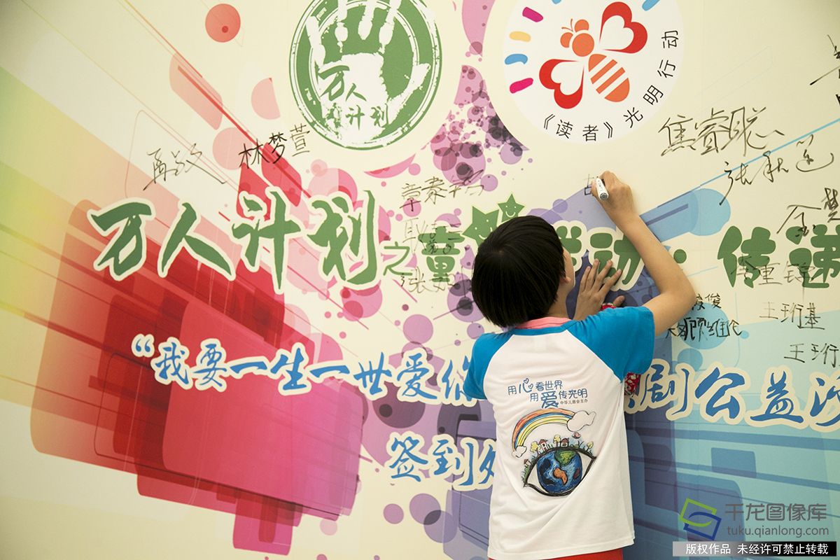 5月13日,孩子们在签名板上签名(图片来源:tuku.qianlong.com)。